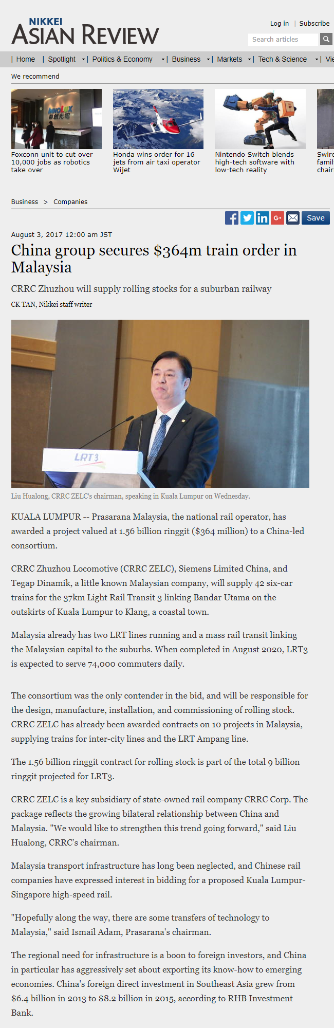 Nikkei Asian Review:China group secures $364m train order in Malaysia