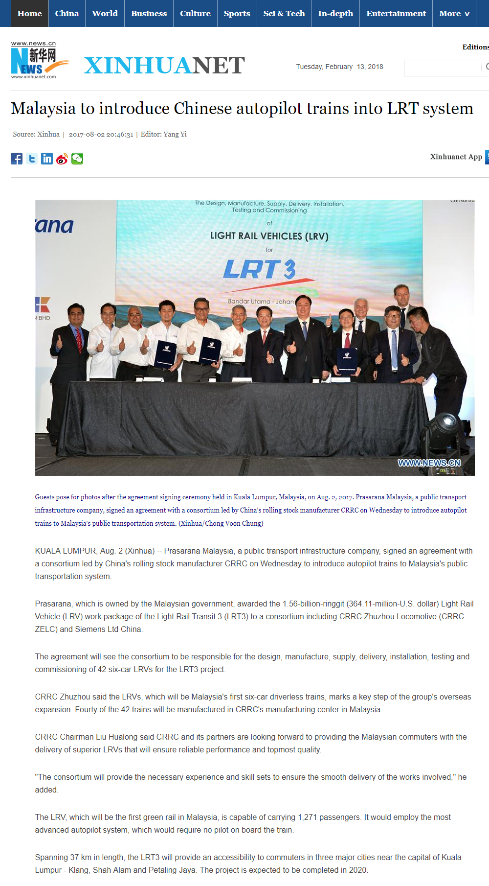 Xin Hua:Malaysia to introduce Chinese autopilot trains into LRT system