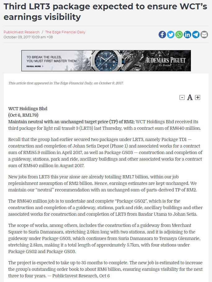 The Edge Markets:Third LRT3 package expected to ensure WCT’s earnings visibility