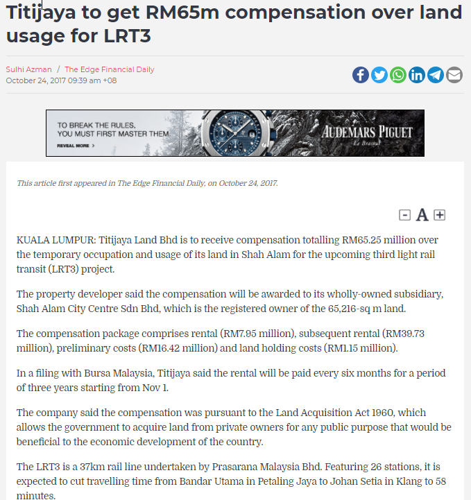 The Edge Markets:Titijaya to get RM65m compensation over land usage for LRT3