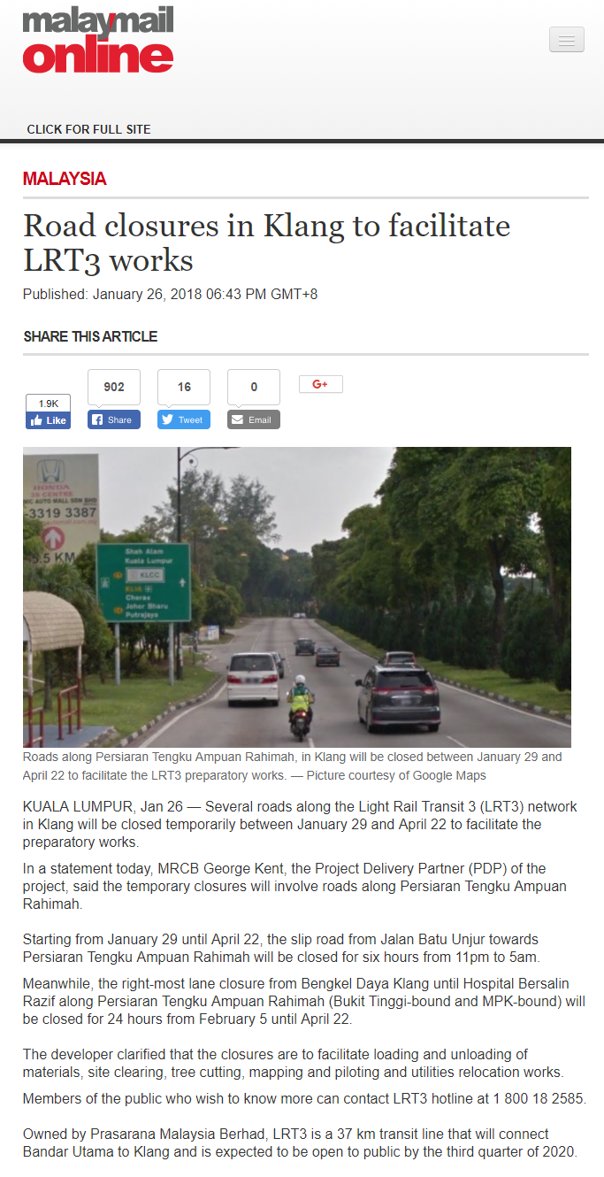 Malay Mail Online: Road closures in Klang to facilitate LRT3 works