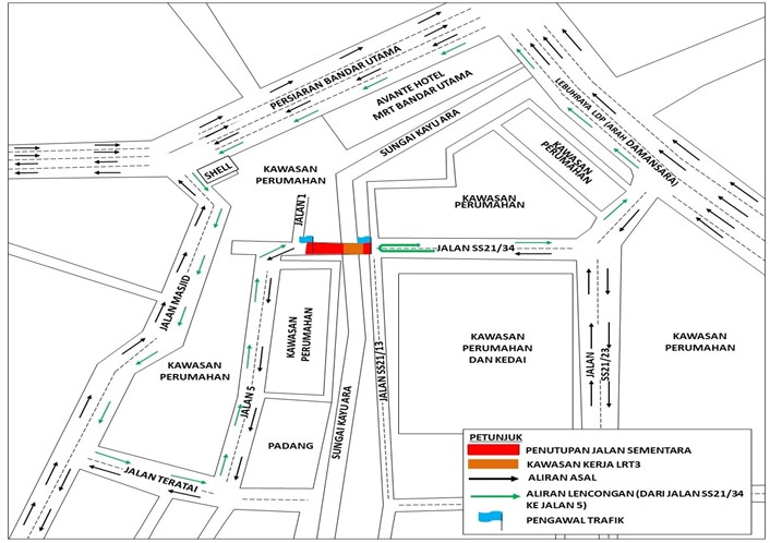 Pengguna jalanraya dari Jalan SS21/34 yang ingin menuju ke Jalan 5 akan dilencongkan ke Lebuharaya Damansara Puchong (arah Damansara), Persiaran Bandar Utama, Jalan Masjid, Jalan Teratai dan Jalan 5 seperti peta di bawah: