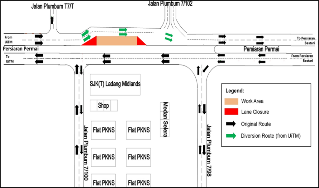 KUALA LUMPUR – 9 MAY 2024: Setia Utama LRT 3 Sdn Bhd, the contractor of the Light Rail Transit 3 (LRT3) project, wishes to inform that there will be lane closure and traffic diversion on Persiaran Permai (Persiaran Bestari-bound), Shah Alam to facilitate LRT3 project related works from 13 May 2024 to 30 June 2024 (Monday to Sunday), 24-hours.